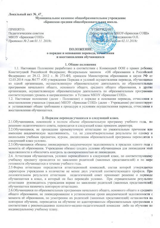 Положение о порядке и основании пеевода, отчисления и восстановления обучающихся (2) Документ подписан электронной подписью Серийный номер 460837604057956529703830632163952415623550190421 Директор Валиджанова Оксана Николаевна Дата подписания документа 13.11.2023 14:55:12 (скачать) (посмотреть) (текст документа)