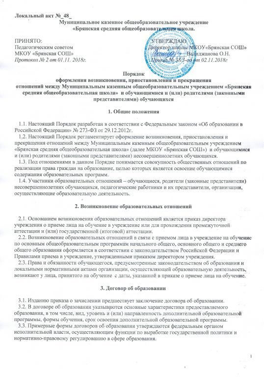 Порядок оформления возникновения, приостановления и прекращения отношений между образовательной организацией и обучающимися (воспитанниками) и (или) родителями (законными представителями) несовершеннолетних