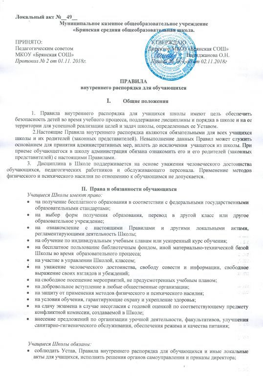 Правила внутреннего распорядка обучающихся (воспитанников)